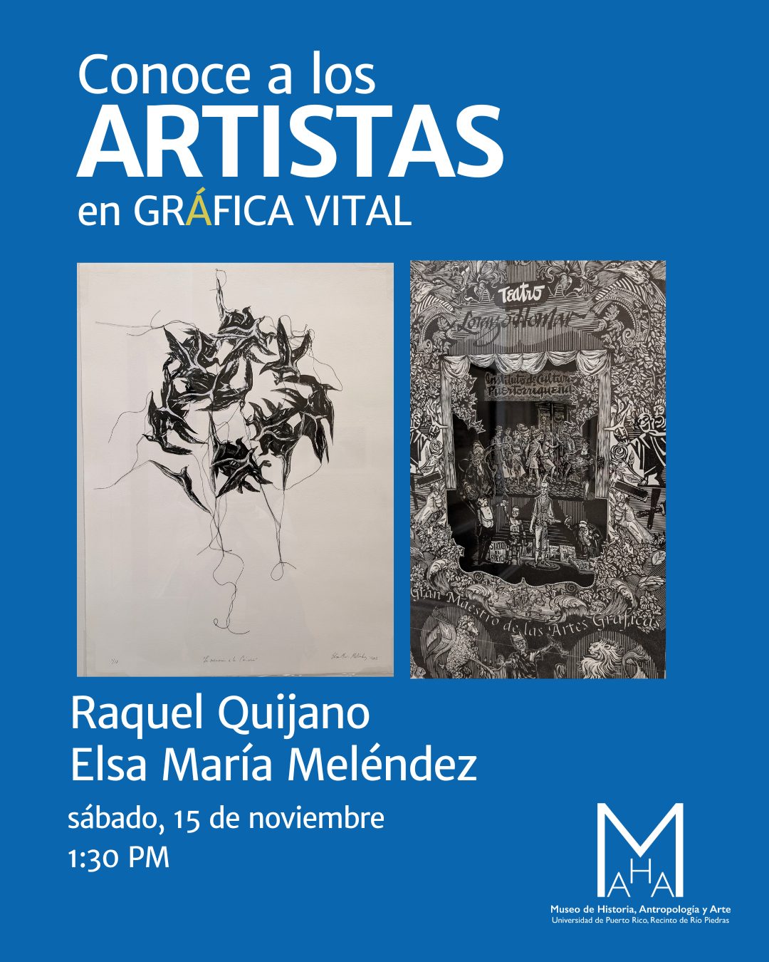 Conoceremos más a fondo a las artistas Raquel Quijano y Elsa María Meléndez y sus procesos creativos a través de un diálogo donde compartirán con el público impresiones, memorias y anécdotas personales.